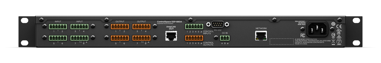 板載連接包括用于進行配置和控制的后面板以太網、RS-232 串口、5 路控制輸入、5 路控制輸出和可發送數字音頻至 Bose 功放的 8 通道 Bose AmpLink 端口。ESP-880A 還支持與行業標準控制系統集成,如 Crestron 和 AMX。并且可與任何兼容的 Bose Professional 終端用戶控制配件(如 ControlCenter 區域控制器以及支持移動設備的 ControlSpace Remote)共同使用。